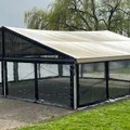 Standaard wordt deze tent geleverd met transparante zijzeilen met zwarte kaders en een zandkleurig dak. Alle alu-frame tenten kunnen wij ook met een systeemvloer bouwen.