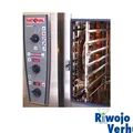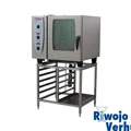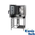 Combi steamer Rational incl. 6 x 1/1 gastronorm roosters wordt geleverd op een vaste verrijdbare kar. De onderkant van de kar is voorzien van 2 rijen GN geleiders (op de foto is er nu maar 1 rij zichtbaar).