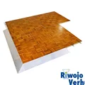 De klikbare parket dansvloerelementen hebben een afmeting van 88x88cm per paneel. En kunnen per stuk gekoppeld worden en omlijst met een aluminium randafwerking waardoor de panelen stabiel aan elkaar blijven liggen.