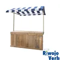 Kraam bestaat uit: 1 blad 80x200 cm. steigerhout, 1 voorzetscherm steigerhout incl. zijkanten, 2 staanders en 1 doek blauw wit linnen incl. latten.