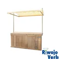 Kraam bestaat uit: 1 blad 80x200 cm. steigerhout, 1 voorzetscherm steigerhout incl. zijkanten, 2 staanders en 1 zeil geel wit incl. latten.