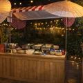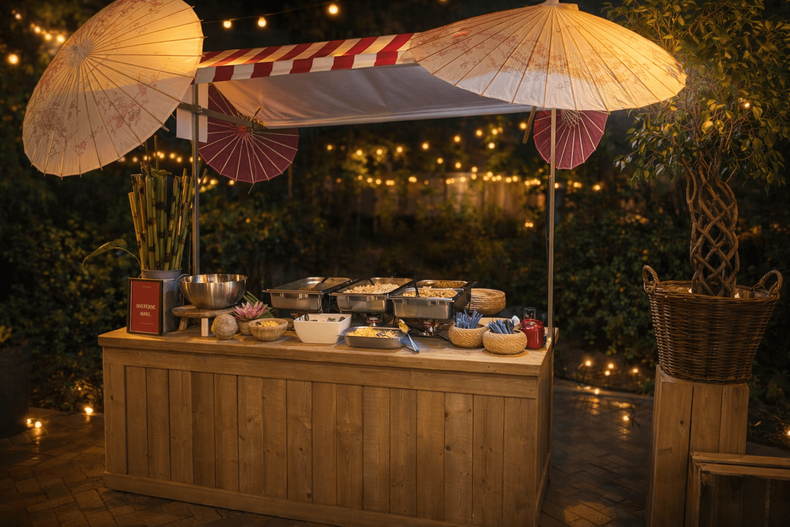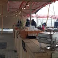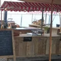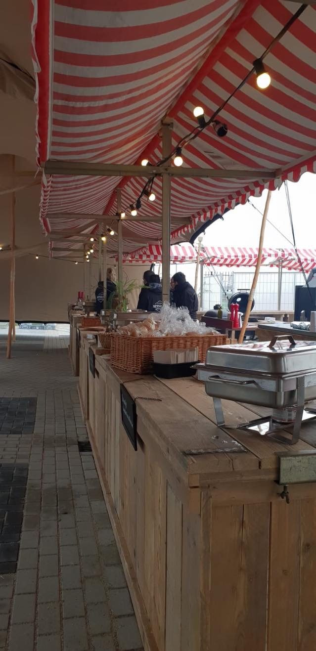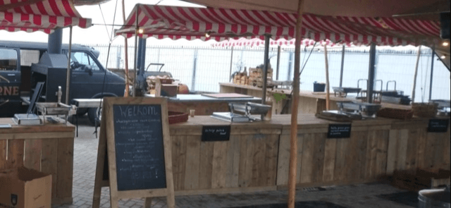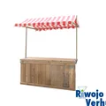 Kraam bestaat uit: 1 blad 80x200 cm. steigerhout, 1 voorzetscherm steigerhout incl. zijkanten, 2 staanders en 1 zeil rood wit incl. latten.