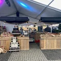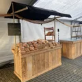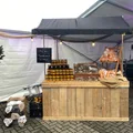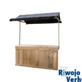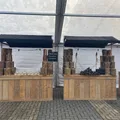 Kraam bestaat uit: 1 blad 80x200 cm. steigerhout, 1 voorzetscherm steigerhout incl. zijkanten, 2 staanders en 1 doek zwart linnen incl. latten.