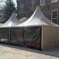 De pagode tent ES84 is een elegante en veelzijdige tent met een kenmerkend puntdak en een strak design. Door de geïntegreerde regengoot loopt het water bij deze pagode mooi weg. Perfect voor evenementen, beurzen en feesten. De 5 x 5 meter pagodetent kunnen wij eindeloos koppelen tot de door u gewenste afmeting. Deze tenten zijn voorzien van opaque zeil (dit is een niet licht doorlatend zeildoek). Standaard worden 2 zijdes voorzien van transparante zeilen en 2 zijdes van dichte zeilen. Op aanvraag is dit geheel naar wens aan te passen. De pagodetent wordt verankerd met grondpennen. Wanneer dit niet mogelijk is kunnen wij de tent verankeren met betonnen ballastblokken (meerprijs). Verder kunnen wij onze pagodetenten ook koppelen aan onze alu-frame tenten.