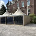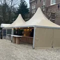 De pagode tent ES84 is een elegante en veelzijdige tent met een kenmerkend puntdak en een strak design. Door de geïntegreerde regengoot loopt het water bij deze pagode mooi weg. Perfect voor evenementen, beurzen en feesten. De 5 x 5 meter pagodetent kunnen wij eindeloos koppelen tot de door u gewenste afmeting. Deze tenten zijn voorzien van opaque zeil (dit is een niet licht doorlatend zeildoek). Standaard worden 2 zijdes voorzien van transparante zeilen en 2 zijdes van dichte zeilen. Op aanvraag is dit geheel naar wens aan te passen. De pagodetent wordt verankerd met grondpennen. Wanneer dit niet mogelijk is kunnen wij de tent verankeren met betonnen ballastblokken (meerprijs). Verder kunnen wij onze pagodetenten ook koppelen aan onze alu-frame tenten.