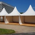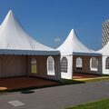 Op de foto's zijn verschillende afmetingen van de pagodetenten zichtbaar (foto 1 betreft 3x een pagodetent 4x4 mtr.)